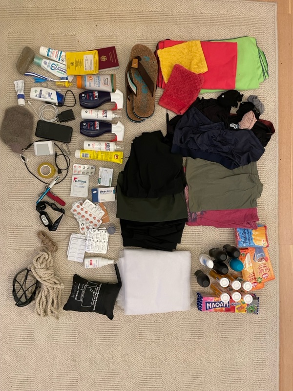 2 Sonnenbrillen, eine lange Hose und zwei kurze Hosen, zwei T-Shirts, Jugendherbergeschlafsack (tolle Idee, danke, S!), 4 Paar kurze Socken, Flipflops, 3 Slips, zwei Handtücher, zwei Lappen. Und natürlich das, was ich gerade trage.