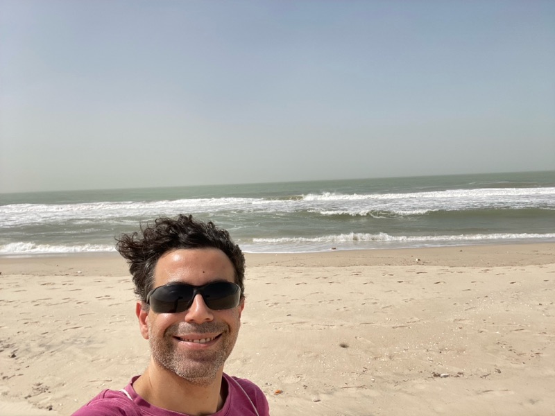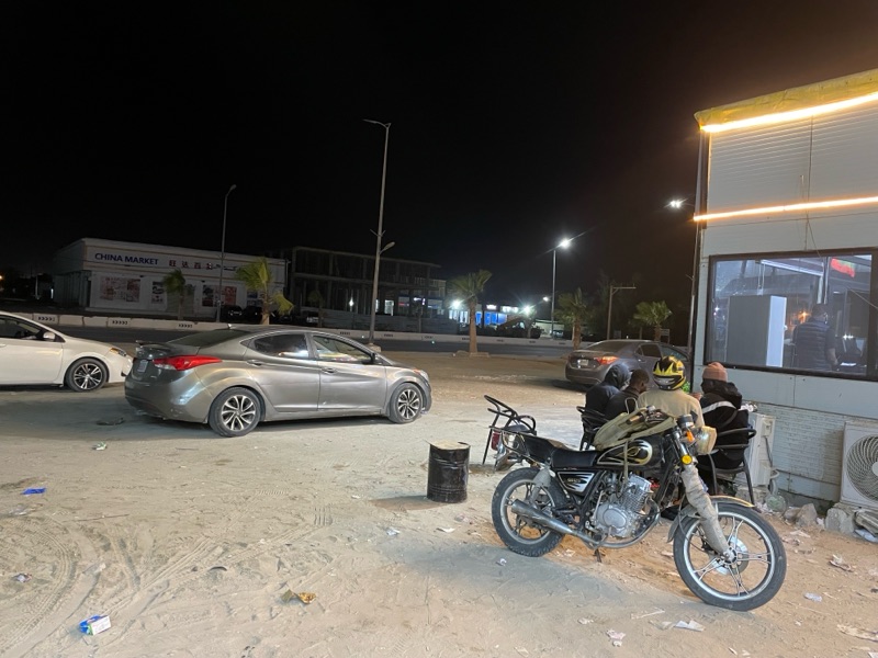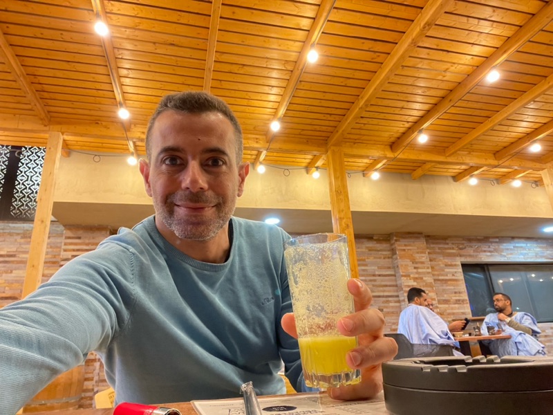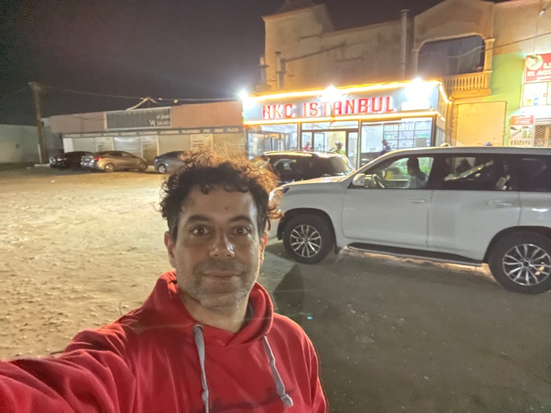 Ich ging zurück, um den Kreis zuschließen. Es waren noch ein paar Kilometer. Es wurde auch etwas voller und moderner. Ein paar Hotels habe ich gefunden. Und natürlich weiterhin viele Restaurants. Übrigens, in einem Restaurant essen, gelang mir nicht. Alles was hier ein Restaurant heißt, ist eigentlich eher eine Art Küche. Da drin sitzen Männer und Frauen und schnippeln und kochen und die Gäste kaufen das Essen zum mitnehmen. Irgendwo sitzen und was essen war in aller nicht Regelmöglich. Erst gegen das Ende meiner Runde, als ich im internationalen und „besseren“ Viertel von Nouakchott war, gab es das eine oder andere Restaurant. Es war nicht sehr einladend und ich wollte unbedingt auch nach Hause. Ich machte weiter und habe erst das Haus von Papis nicht gefunden. Es war ärgerlich, denn ich suchte circa eine halbe Stunde. Ich Idiot . Endlich angekommen habe ich geduscht und meine 42.000 Schritten auf der Uhr bewundert. Dann ging ich zum Restaurant von Papis und habe mir ein Hähnchen Sandwich bestellt. Sehr lecker. Dann fand ich ein Hotel, dass ein Café hat und auch Internet. Und nun sitze ich hier mit meinem Ananassaft und mach etwas Reisebericht.