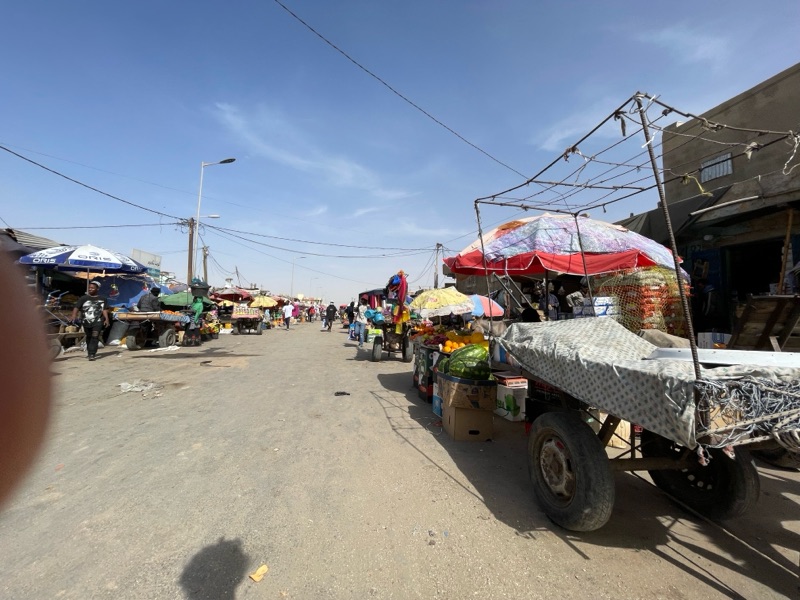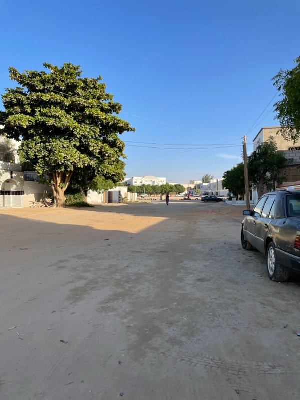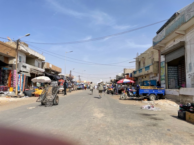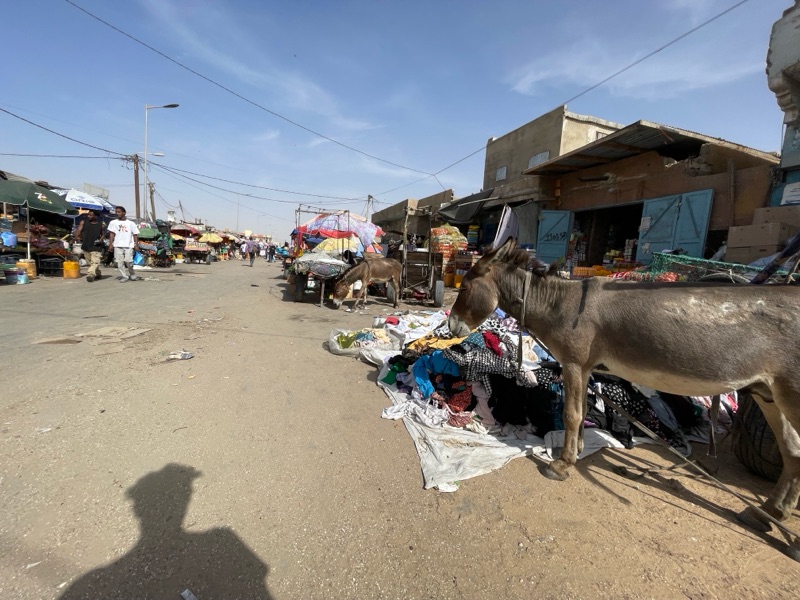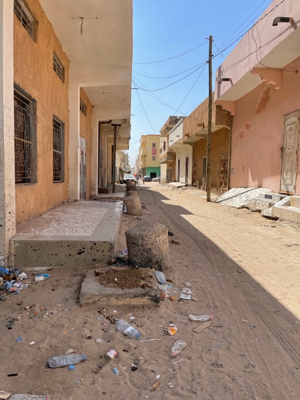 Richtung Zentrum wurde es etwas weniger arm. Grundsätzlich sind die Hauptstraßen asphaltiert, allerdings in der Regel ohne Bürgersteige, beziehungsweise wenn mal ein Bürgersteig gibt, dann wird dieser Zweck entfremdet. D.h., man läuft stets auf der Straße. Es ist ein gesundes und etwas beschwerliches Laufen, denn stets läuft man auf sehr feinem Sand. Man sollte aus Mauretanien Sand für unsere Spielplätze importieren. Der ist echt angenehm fein.
