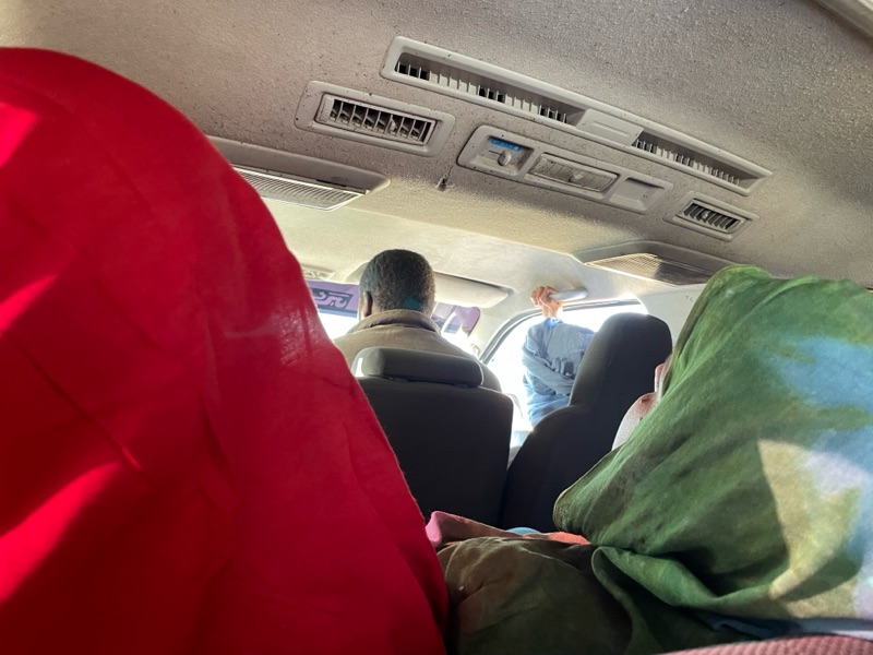 80 km und 1,5h später stieg ein Gasthaus und ich wechselte den Platz. Nach weiteren 5 km stiegen weitere Leute aus, und die hintere Tür ging nicht mehr zu. Ich war dann allein auf der hinteren Bank, und der Fahrer hat lange versucht, die Tür mit Gewalt zu zu bekommen. Dann hat er ein Provisorium gefunden. Ich sollte einfach festhalten.