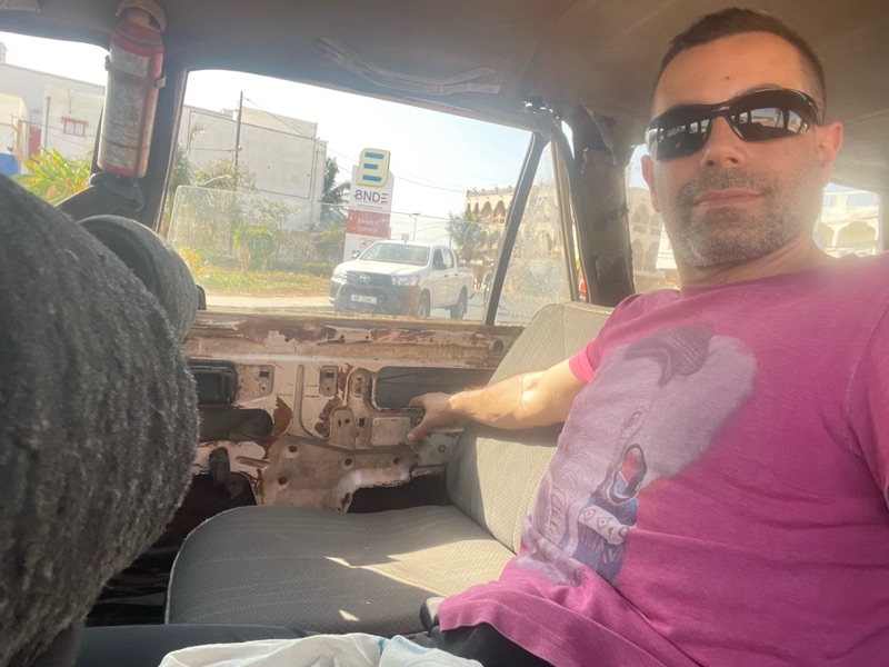Jetzt warte ich am Busbahnhof, bis die Fahrt losgeht. Leider ist es aber kein Bus, sondern ein echtes Auto-Wrack. Ich überlege mir, ob ich wirklich hier rein gequetscht werden möchte.