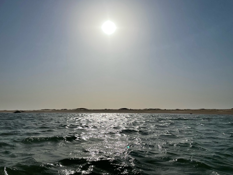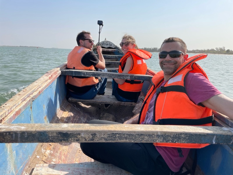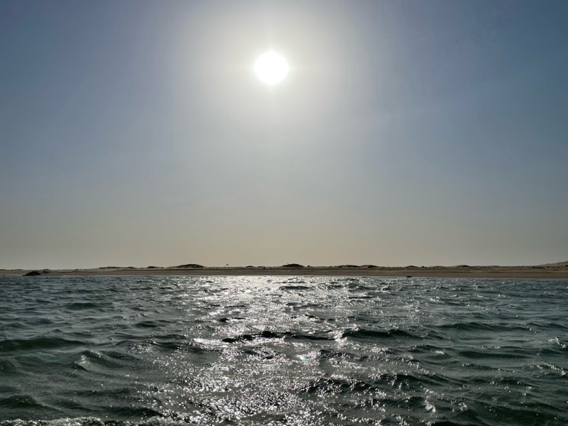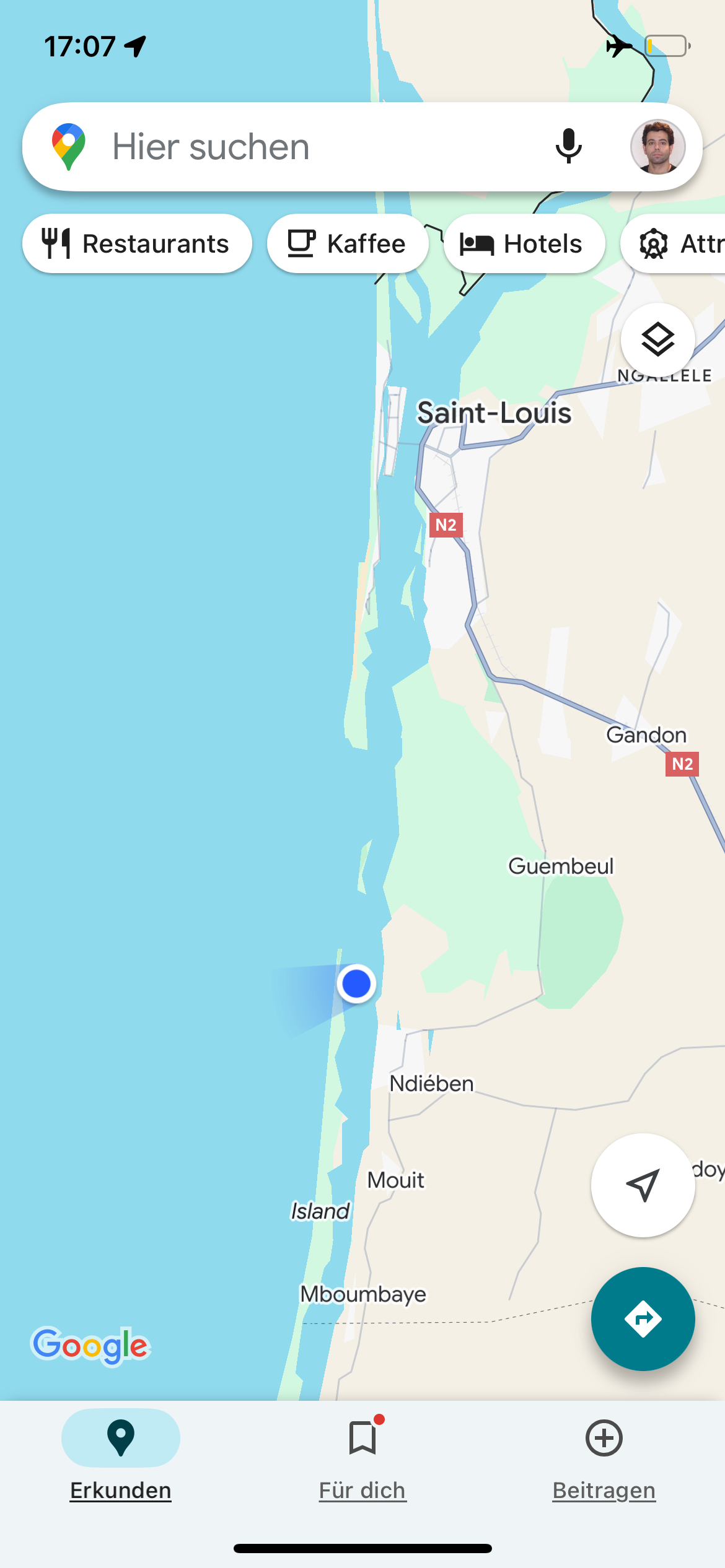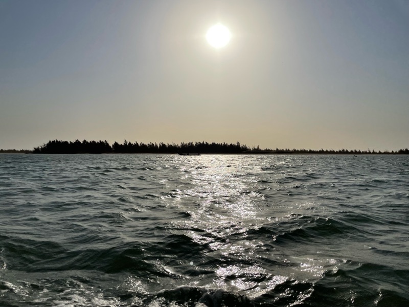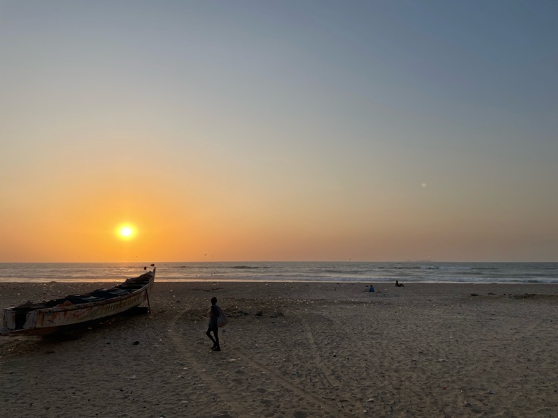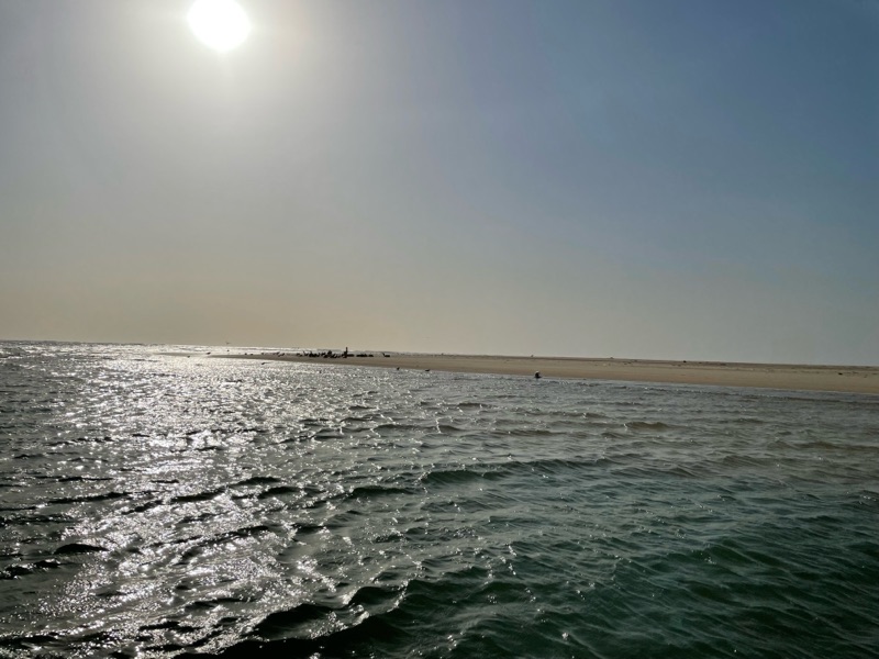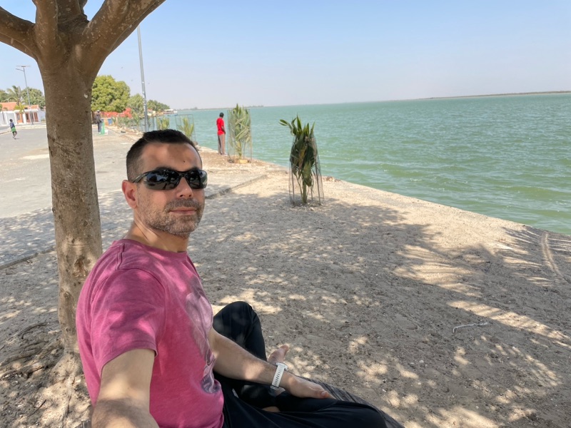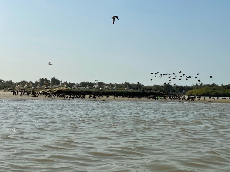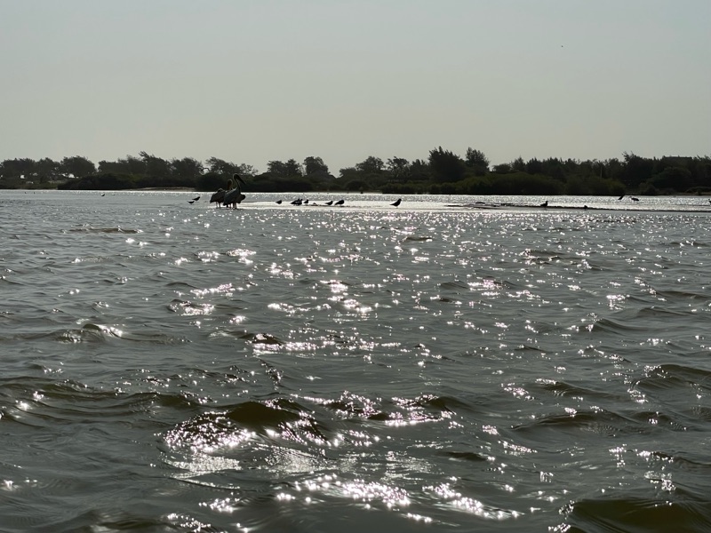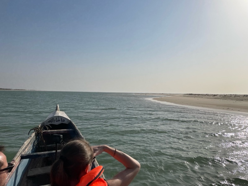 Dann fande ich einen Geldwechsler und habe direkt 100 $ gewechselt. Ich dachte, mit der Geschwindigkeit, mit der ich bisher Geld ausgegeben habe, könnte mir das für die ganze Reise im Senegal ausreichen. Später am Tag wird es sich zeigen, dass ich stark daneben lag. Ich nahm das Geld und ging direkt in die Kneipe neben dem Wechsler für zwei kalte Biere. Ein Bier drei Euro. Europäischer Preis, aber ja nun. Der Besitzer der Kneipe ist ein Franzose, Marc. Ich fragte ihn, ob es sich lohnt zum Nationalpark zu fahren, wo die ganzen Vögel sind. Er meinte ja und rief sofort einen Reiseführer, den er kannte, an. Er sei gut. Der Reiseführer war nach 5 Minuten da und hat mir erzählt, so ein Ausflug wäre morgen und würde 5-6 Stunden dauern, davon drei im Auto. 40.000 CFA (fast 70 €). Alternativerweise kann ich jetzt direkt mit ihm kommen. Er nehme zwei Italiener auf eine Bootfahrt Richtung Süden. Bis zum Treffen des Flusses Senegal mit dem atlantischen Ozean. Man sehe auch Vögel, aber keine Krokodile. Das dauert zweieinhalb Stunden und kostet 20000 CFA. Das war eine bessere Idee und so habe ich das gemacht. Hier sind ein paar Fotos.