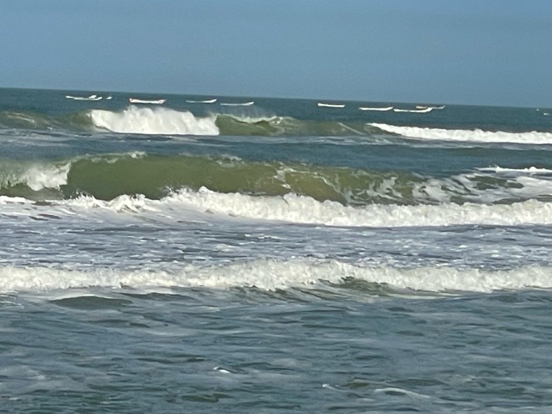 Dann ginge ich aus. Zum Strand. Es war bestes Wetter. Ich sah in der Ferne eine Menschentraube. Da dachte ich mir, wo Menschen gibt, wird es interessant. Ich ging dorthin und hab mich hingesetzt und beobachtet. Es waren wohl diese langen Boote bei der Arbeit. Hier ist ein Foto, wie sie auf „hoher“ See sind.