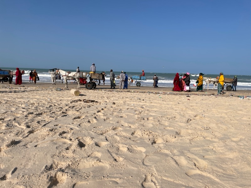 Und wenn sie was gefangen haben, dann fahren sie zurück ans Land. Ein Boot auf einmal. Wenn das Boot ankommt, rennen alle Menschen zu dem. Die Fische werden entladen in die Pferde-Holzkarren. Dann werden die Fische irgendwo hinweg gefahren. Es bleiben aber offensichtlich dennoch genug Fische, die auf die Menschen, die dort sich ansammeln, abfallen. In der Regel, leider wieso oft für schlecht bezahlte Arbeiten, Frauen. Diese Frauen tragen Eimer mit sich und Bekommen Große Fische. Ob sie diese kaufen, oder geschenkt bekommen, konnte ich nicht erkennen. Jedenfalls warten die Menschen dann aufs nächste Boot, dass ebenfalls kommt, ein paar 100 Kilo Fisch entlädt, und die restlichen Fische auf die Menschen/Frauen verteilt.