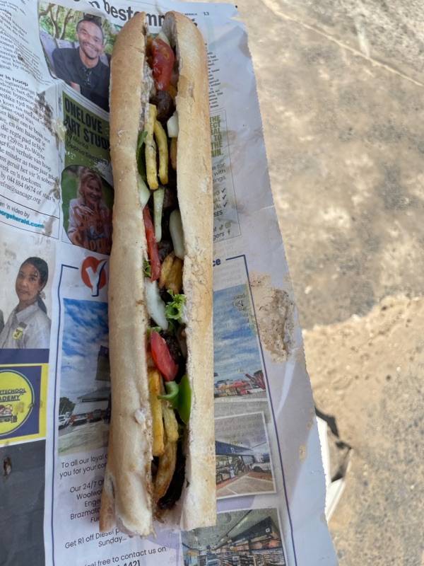 Dann fande ich zu essen. Ich sah nämlich, dass am Straßenrand viele Frauen Baguettes verkauften, die sie vor den Kunden geschmiert haben. Ich stellte mich ran und sagte, dass ich das gleiche haben will. Dann fragte sie mich, ob dies oder jenes das Gleiche sei. Das eine war für 300 das andere für 800. Ich als reicher Europäer nahm natürlich das für 800. Das ist mit gegrilltem Fleisch. Sie schnitt das Baguette auf und beschmierte es mit irgendeinem Fett, mit gerößteten Zwiebeln in Öl, Fleischstückchen und dann noch Tomate und Salat. Die beste Mischung für das Magenverderben. Egal, es sah lecker aus und ich hatte Hunger. Ich esse seit zwei Tagen nur Baguette, ohne Nix.