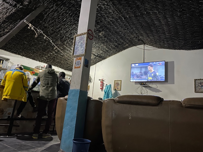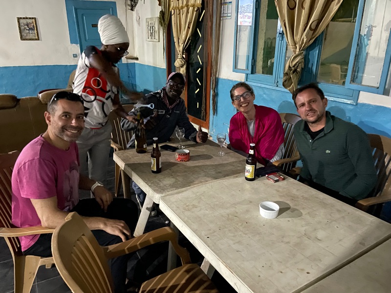 Ich war froh, dass ich mit ihm die Reise am nächsten Tag nicht gemacht habe. Er war kein guter Touristenführer. Dann ging er mit uns in die Kneipe und hat versucht, mir zu helfen, einen Platz im Reisebus nach Dakar zu bekommen. Es sei günstig und bequem und vor allem sicher. Der Bus sei voll gewesen. Dann hat er mich bequatscht, eine andere Transportmöglichkeit zu nehmen. Sammeltaxi. Mal ohne die vielen Details: Am Ende hab ich zugeschlagen für 20.000 CFA. Das Auto würde mich von zu Hause abholen. Um sechs in der Früh. Ich war ein bisschen in Sorge, dass das ganze eine Farce ist. Egal. Ich zahlte aus Versehen für alle. Dann schlug er vor, dass wir alle in eine senegalesische Kneipe fahren. Das taten wir. Das war tatsächlich ein Erlebnis. Allerdings war ich etwas betrübt, weil einerseits ich nicht sicher war, ob das morgen alles klappen würde. Andererseits hat mir Elhadji Stress machte. Er bat mich um Geld. Es waren nur 5000 CFA, was nicht viel ist. Aber dennoch unanständig. Und dann alle halbe Stunde eine Nachricht, wann ich zu Hause sein werde, weil seine Frau ganz dringend das Geld braucht. Das war unangenehm. In der Kneipe kamen allerlei Menschen zu uns an den Tisch. Es sahen für mich so aus, als ob sie alle Freunde vom Reiseführer Babacar sind. Unter anderem eine Francoise, halb aus Frankreich, Halb aus Togo, lebt in Senegal. Sie sagte, sie fährt morgen auch nach Dakar und wir sollten die Nummer tauschen, so dass wir vielleicht gemeinsam was unternehmen.