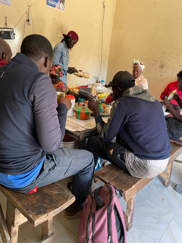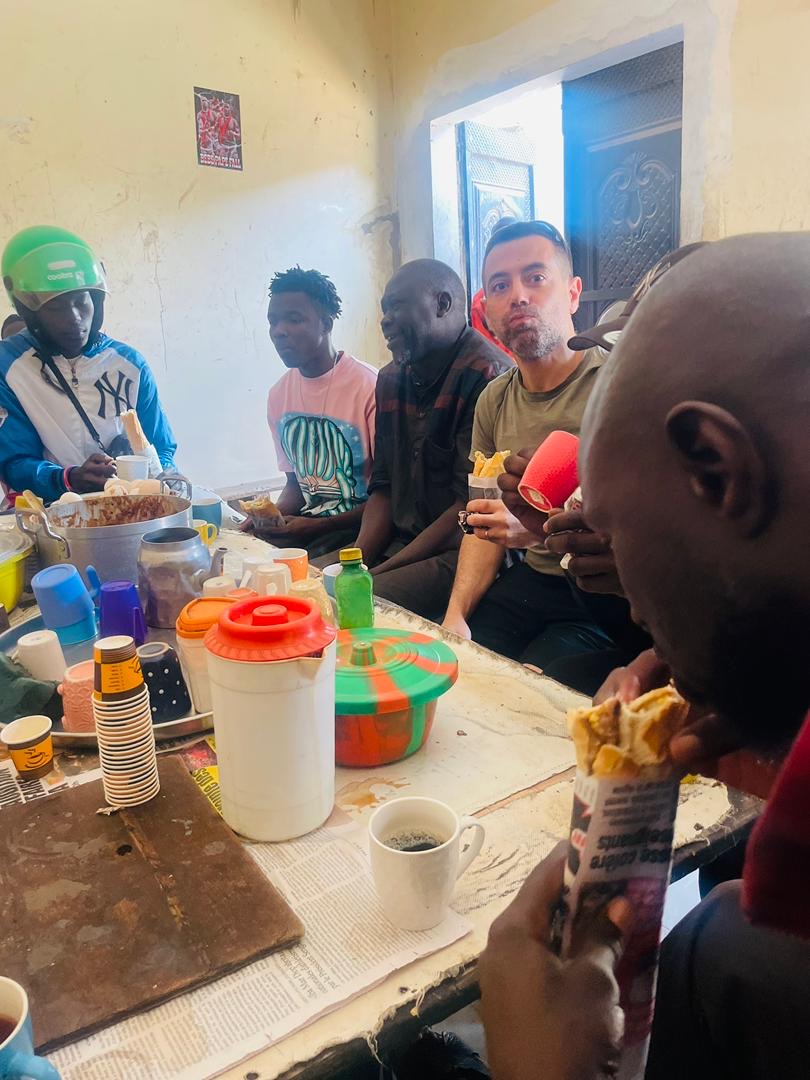 Billy fragte mich, ob ich frühstücken möchte. Ich hatte Hunger. Er nahm mich zu einem kleinen Restaurant. Es war ein Raum und ein großer Tisch in der Mitte und zwei ältere Frauen haben dort Baguette geschmiert. Um den Tisch rum saßen nur Männer, offenbar Arbeiter, die die Brote vor Ort bestellen und dort essen. Auch ich saß dort und habe zwei große Brote gegessen. Sie waren super lecker. Ebenso etwas Scharf. Dieses Mal ohne Fleisch. Es war Zwiebel und Fett und ein gekochtes Ei. Dazu gab es einen Tee, der nicht genießbar ist.