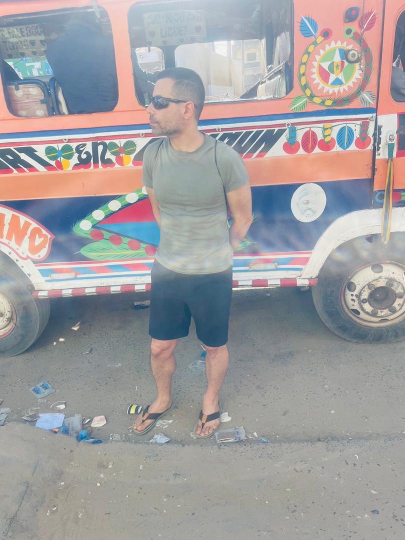 In der Busstation hat mich Billy nochmals wie ein kleines Kind geführt. Ich dachte, es war super schön mit ihm, aber gut, dass ich jetzt wegfahre. Ich hatte das Gefühl, ich kann nicht das machen, was ich möchte. Ich bin dann trotzig in eine andere Richtung gegangen, um zu schauen, welche Busse wohin fahren. Da schrie er mir hinterher und sagte, ich soll mitkommen woanders sind die richtigen Busse 😅. Auf dem Weg hat er meine Hand nach unten gedruckt, weil ich sie hoch mit dem Handy hob. Dabei hat er sein Handy immer draußen in seiner Hand und schaut sich Videos an. Diese Bevormundung fand ich ein bisschen zu viel. Doch andererseits kann ich mir vorstellen, dass er nicht riskieren will, dass ich schlechte Erfahrungen mache. Oder er denkt, dass ich unbeholfen bin. Ich sagte ihm, Billy, ich bin in Damaskus aufgewachsen. All das kenne ich schon. Er lachte mich an. Ich glaube, er hat mich nicht verstanden. Am Bus angekommen, war der Preis klar, sogar mit Beleg. Es war nicht wirklich teuer. Das war der Bus nach Karang, an der Grenze zu The Gambia. Circa 30 km vorher werde ich aussteigen. Hier ist der Bus, der nach der obligatorischen Wartezeit, bis er voll wird, doch losgefahren ist.
