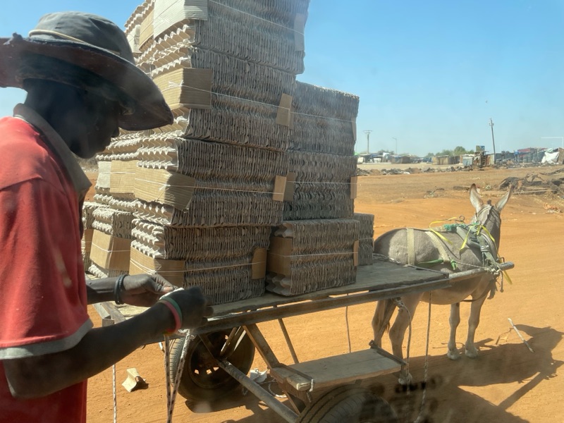 Wir haben auch ewig angehalten, um diese Ladung Eierkartons auf das Dach des Busses zu bringen. Aerodynamisch waren wir danach mit Sicherheit nicht. Das Risiko dadurch kam on top vom Risiko des gewagten und schnellen Fahrens.