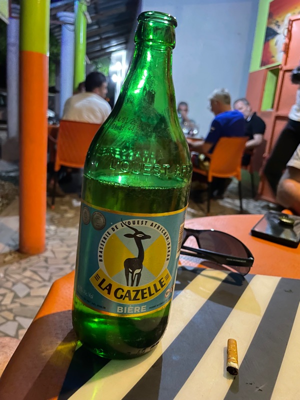 Danach war ich echt platt. Einerseits lange nicht gelaufen, andererseits ein bisschen mehr geraucht in letzter Zeit und abschließend die Hitze. Ich kam nach Hause und habe mich über die Dusche und die Privatsphäre sehr gefreut. Und ich lag lethargisch eine oder 2 Stunden auf dem Bett. Dann ging ich auf Essenswoche. In der ersten Bar trank ich ein Bier und ließ mich von einem örtlichen Künstler bequatschen. Dann ginge ich zum zweiten Restaurant, da wo ich gestern Abend war, und hab Fisch und Reis gegessen. Bei weitem nicht so gut wie in Dakar mit Billy. Heute Abend esse ich woanders. Das zweite Bier habe ich auch intus. Jedes Bier ist 630 ml. Ich glaube, ich gehe jetzt wieder nach Hause und leg mich erneut hin, bevor ich abends nochmals losziehe. Ah ja, im Restaurant habe ich Ralf kennengelernt. Ein netter deutscher aus Frankfurt, der gerne reißt und nun hier für zehn Tage in Senegal ist. Es war ein gutes Gespräch.