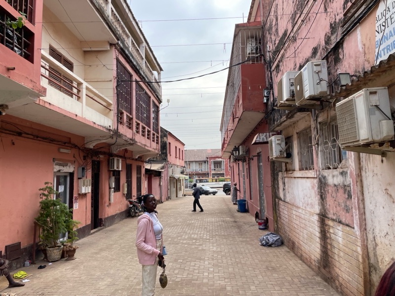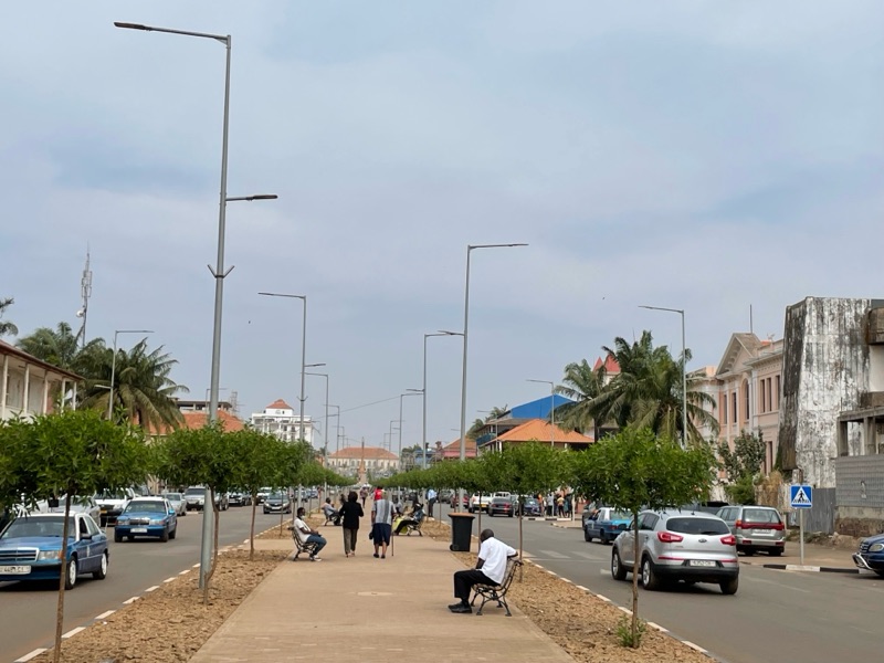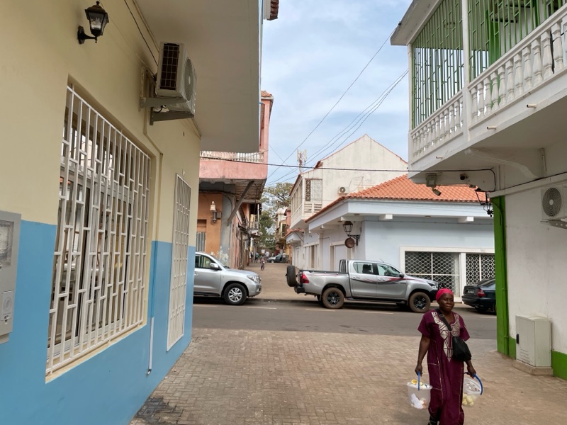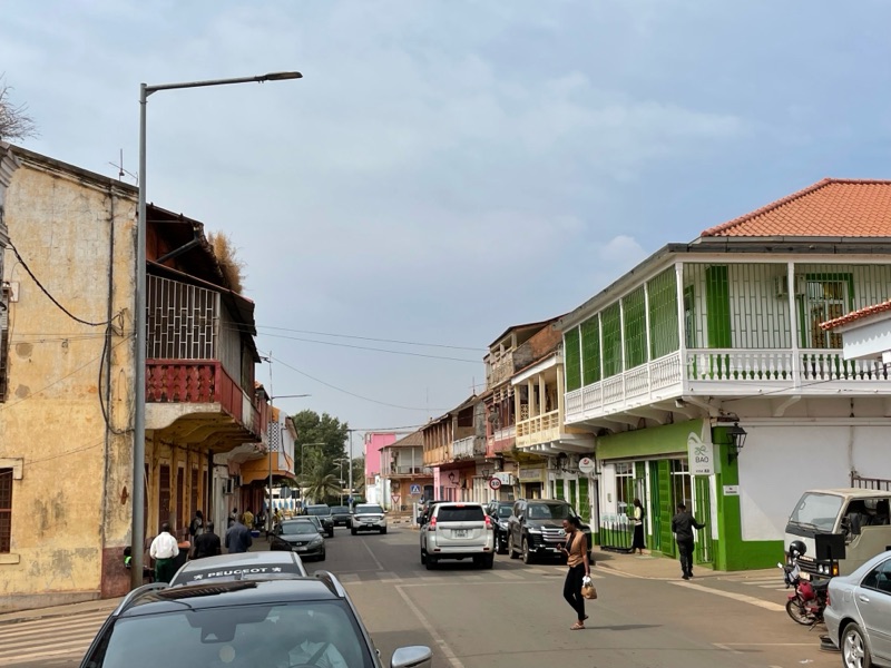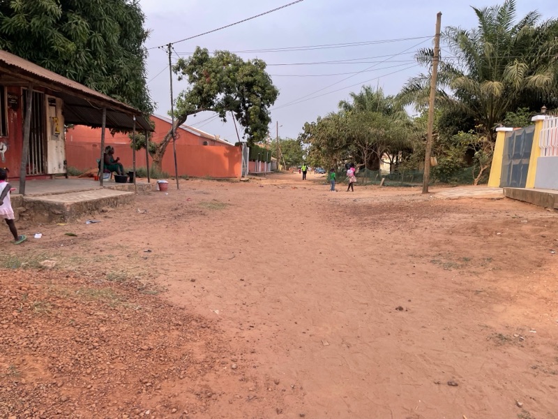 Die Märkte hier sind lebendig und voll. Die Straßen sind belebt – die Hauptstraßen asphaltiert, der Rest nicht. Guinea-Bissau wirkt auf mich irgendwie noch ein bisschen „afrikanischer“. Es ist grüner, überall stehen Mangobäume oder Cashewbäume. Die Häuser sehen aus, wie man sich „typisch afrikanische“ Häuser vorstellt: freistehend, nicht in Reihen wie in anderen Städten. Sie haben große, stark geneigte Dächer, die weit über die Wände hinausragen, darunter eine Veranda, die das ganze Haus umgibt. Die Abstände zwischen den Häusern sind größer, und dazwischen gibt es offene Flächen – keine richtigen Straßen, sondern eher Felder mit Wegen und Wasserläufen. Sobald man das Zentrum verlässt, fühlt es sich an wie ein Dorf.