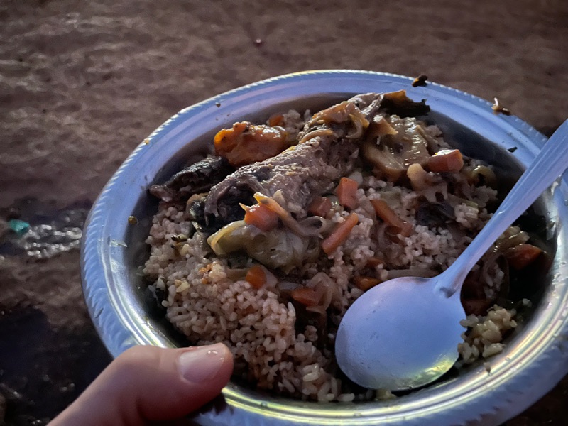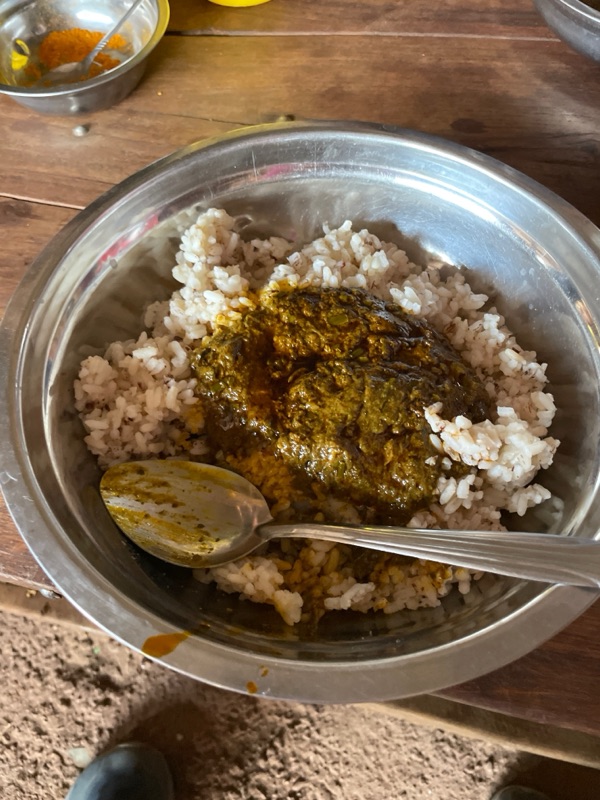 Abends Reis mit Fisch senegalischer Art. Besser. Es war aber nach dem sie zugemacht haben. Daher kalt. Ich bekam einen Stuhl und saß vor der Hütte mit meiner Schüssel auf dem Schoß und aß und schaute die Fußgänger und Motorräder an.