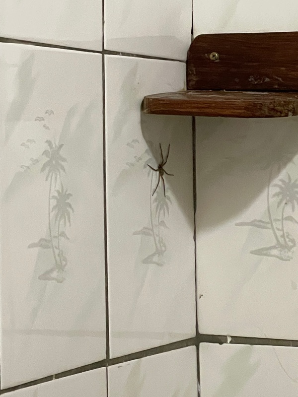 Während ich am Morgen meinen leichten Durchfall fortsetzte und mich über das schlechte Internet (bisher war das Internet die ganze Zeit sehr gut) ärgerte, beglückte mich diese Spinne im Bad.