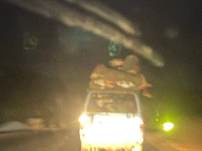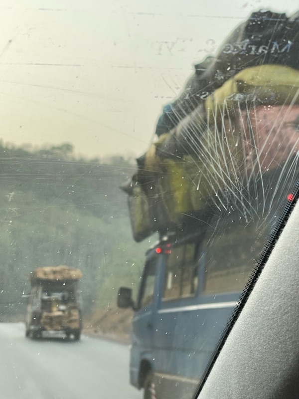 Die Autos hier fahren richtig überladen. Offenbar lohnt es sich sonst nicht. Viele Autos haben eine Ladung auf dem Dach, die höher ist als das Auto selbst. Auf der Ladung sitzen noch Leute, hinten am Heck stehen auf der Stoßstange Leute oder sind Motorräder angeschnallt. Im Auto sind zwischen 13 und 16 Personen. Es folgen ein paar Fotos, wobei ich die krassesten Beladungen doch nicht rechtzeitig fotografieren konnte. Tiere. Kühlschränke. Ernte. Autoteile. Alles. Ich hab die ganze Zeit gewartet, bis ein Unfall passiert. Das war ein Nervenkitzel. Auch wahnsinnig viele Autos sind liegen geblieben, vor allem LKWs. Zum Glück fuhr unser Fahrer verhältnismäßig gut.