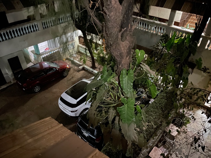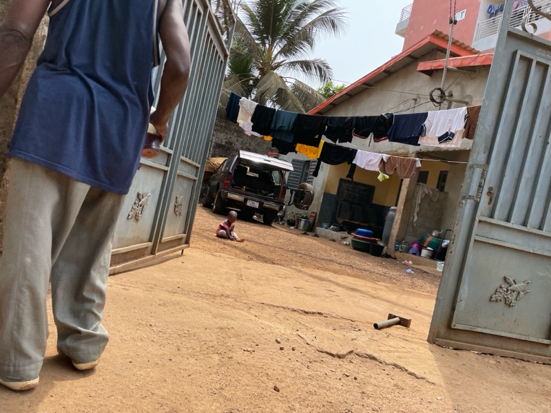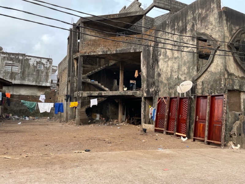 Fast alle Häuser sind hinter Mauern. Bessere Häuser haben sogar Stacheldraht oder Elektrozaun. Die Verriegelung der Fenstern mit Gittern habe ich schon in Bissau gesehen. Hier ist es aber wirklich extrem. Nur in den ganzen armen Viertel gibt es manchmal keine Mauer um die Häuser. Manchmal sind es mehrere Häuser, die gemeinsam eine kleine Gemeinde bilden, mit Hof und schon besserer Atmosphäre. Ob das Großfamilien oder Nachbarn sind, weiß ich nicht.